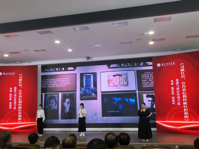 公司参赛作品以经典文学著作《红岩》为蓝本,演讲团队由旅游2441班刘涵、旅游2442班杨瑞铭、酒店2441班杨思晗三位同学组成,辅导员付睿思担任指导老师。三位同学将读书感悟与专业所学相结合,深情讲述江姐、许云峰等革命先烈的事迹,以饱满的舞台张力、富有感染力的语言表达,带领观众重温那段峥嵘岁月,展现了新时代青年对红色文化的深刻理解与传承。