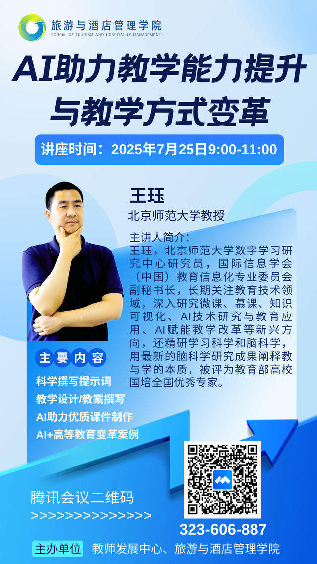 (供稿:蒋昕)为进一步提高教师数字素养能力,7月25日公司邀请北京师范大学数字学习研究中心王珏研究员以在线会议的方式为全体教师做“AI助力教学能力提升与教学方式变革”的专题培训。王珏研究员聚焦科学撰写提示词、教学设计/教案撰写、AI助力优质课件制作、AI+高等教育变革案例4个主题,指导教师边学边用,深入体会和掌握AI助力教学能力提升的关键要点,受到参训老师一致好评。
