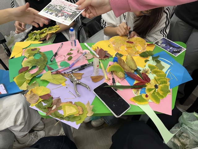 活动伊始,参与同学们在心协工作人员的引导下,漫步于秋色浸染的校园。大家兴致勃勃地捡拾起地上形态各异、色彩斑斓的落叶,银杏的金黄、枫叶的赤红、梧桐的棕褐……每一片叶子都承载着秋日的气息,成为了后续创作中最天然、最独特的素材。欢声笑语中,同学们不仅收集了自然的馈赠,也初步放松了身心。